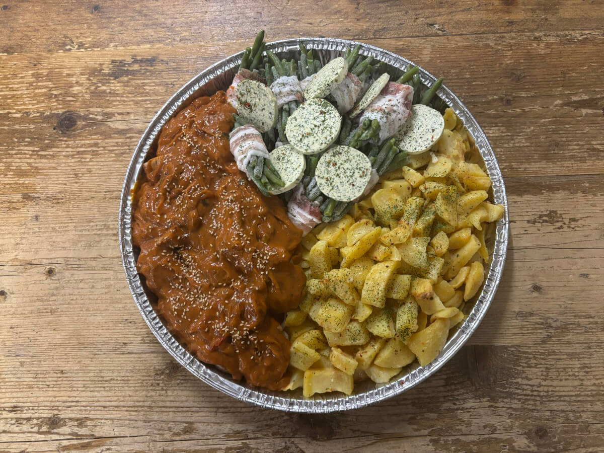 - Inhoud: haricot verts, gebakken aardappels en varkenshaas stroganoff
