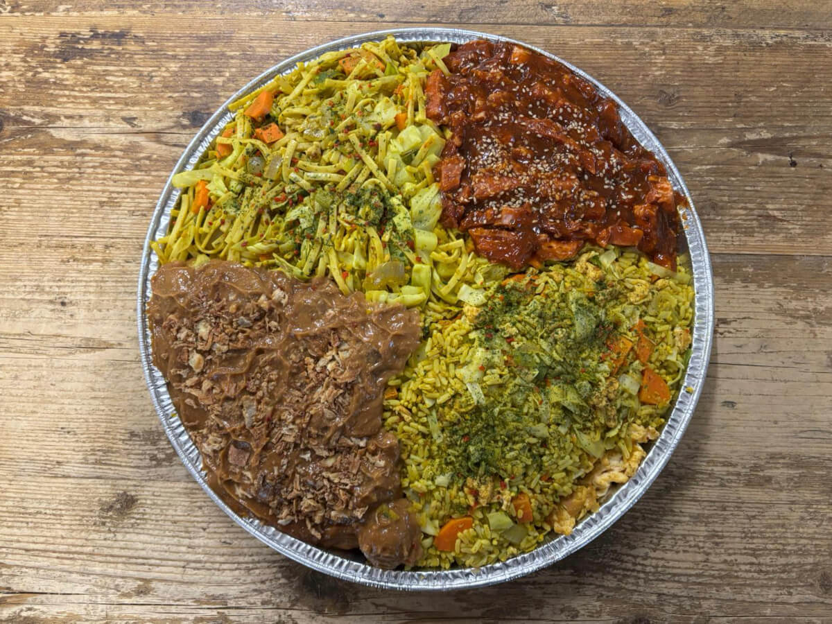 - Inhoud: gevuld met nasi, bami, kipsaté en gehaktballetjes in zoetzure saus