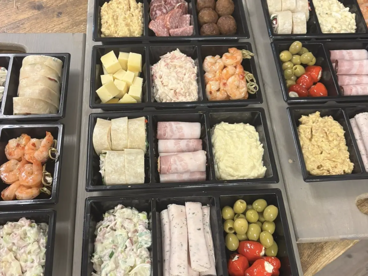 - Inhoud: plank gevuld met diverse salades, hapjes, kaas en worst